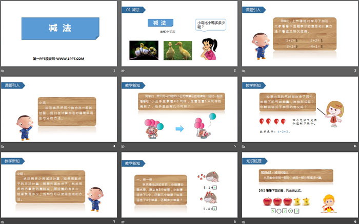 关键词:人教版一年级上册数学PPT课件免费下载,减法PPT下载,1-5的认识和加减法PPT下载,.PPT格式;