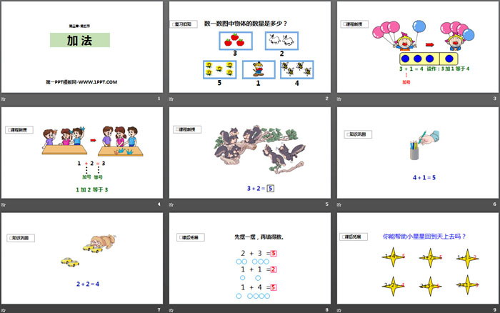 关键词:人教版一年级上册数学PPT课件免费下载,加法PPT下载,1-5的认识和加减法PPT下载,.PPT格式;