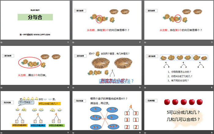 关键词:人教版一年级上册数学PPT课件免费下载,分与合PPT下载,1-5的认识和加减法PPT下载,.PPT格式;
