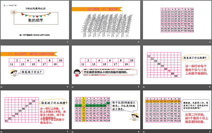 关键词:人教版一年级下册数学PPT课件免费下载,数的顺序PPT下载,100以内数的认识PPT下载,.PPT格式;