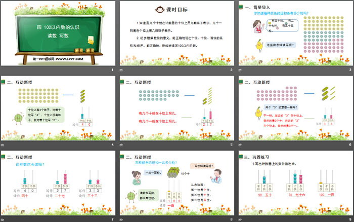 关键词:人教版一年级下册数学PPT课件免费下载,读数写数PPT下载,100以内数的认识PPT下载,.PPT格式;