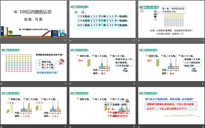 关键词:人教版一年级下册数学PPT课件免费下载,读数写数PPT下载,100以内数的认识PPT下载,.PPT格式;