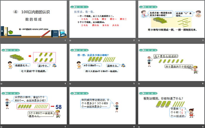 关键词:人教版一年级下册数学PPT课件免费下载,数的组成PPT下载,100以内数的认识PPT下载,.PPT格式;