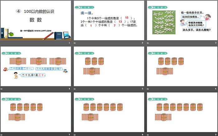 关键词:人教版一年级下册数学PPT课件免费下载,数数PPT下载,100以内数的认识PPT下载,.PPT格式;
