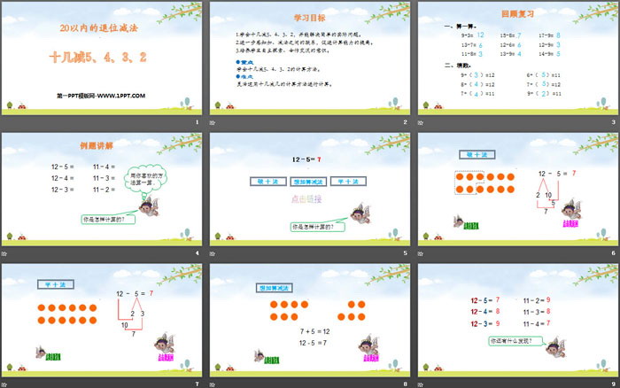 关键词:人教版一年级下册数学PPT课件免费下载,20以内的退位减法PPT下载,十几减5432PPT下载,.PPT格式;