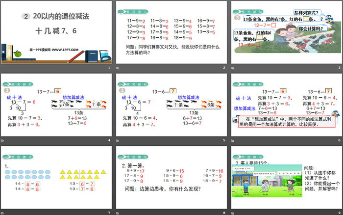 关键词:人教版一年级下册数学PPT课件免费下载,20以内的退位减法PPT下载,十几减76PPT下载,.PPT格式;