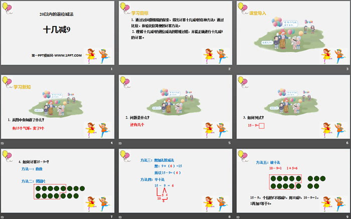 关键词:人教版一年级下册数学PPT课件免费下载,十几减9PPT下载,20以内的退位减法PPT下载,.PPT格式;