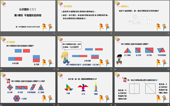 关键词:人教版一年级下册数学PPT课件免费下载,平面图形的拼组PPT下载,认识图形PPT下载,.PPT格式;