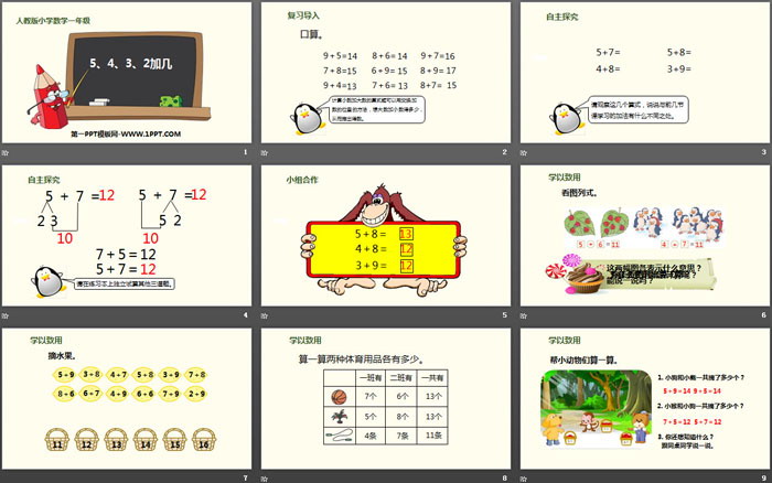 关键词:人教版一年级上册数学PPT课件免费下载,20以内的进位加法PPT下载,543加几PPT下载,.PPT格式;