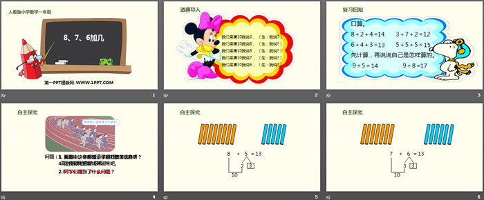 关键词:人教版一年级上册数学PPT课件免费下载,20以内的进位加法PPT下载,876加几PPT下载,.PPT格式;