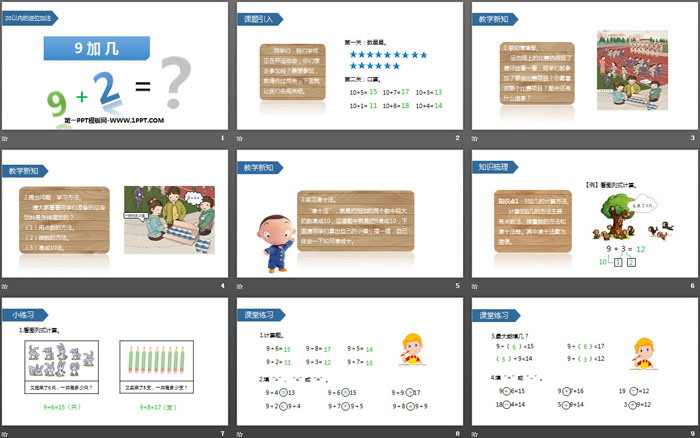 关键词:人教版一年级上册数学PPT课件免费下载,9加几PPT下载,20以内的进位加法PPT下载,.PPT格式;