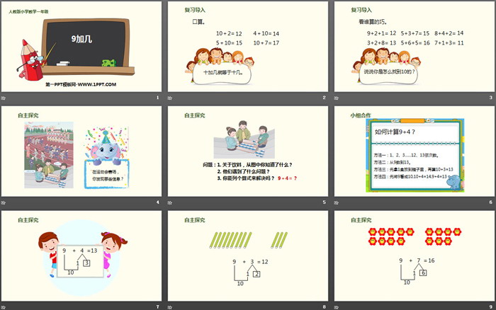关键词:人教版一年级上册数学PPT课件免费下载,9加几PPT下载,20以内的进位加法PPT下载,.PPT格式;