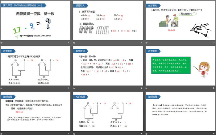 关键词:人教版一年级下册数学PPT课件免费下载,两位数减一位数整十数PPT下载,100以内的加法和减法PPT下载,.PPT格式;