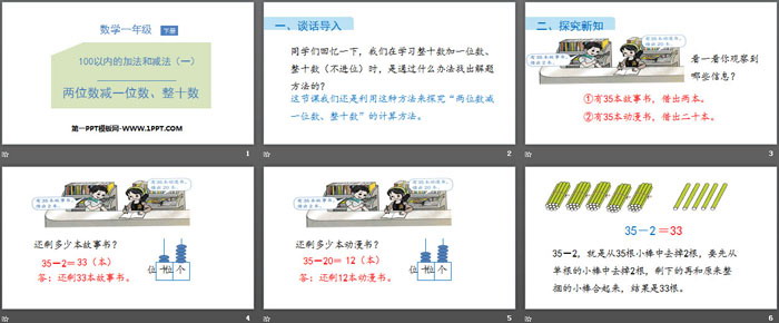 关键词:人教版一年级下册数学PPT课件免费下载,两位数减一位数整十数PPT下载,100以内的加法和减法PPT下载,.PPT格式;