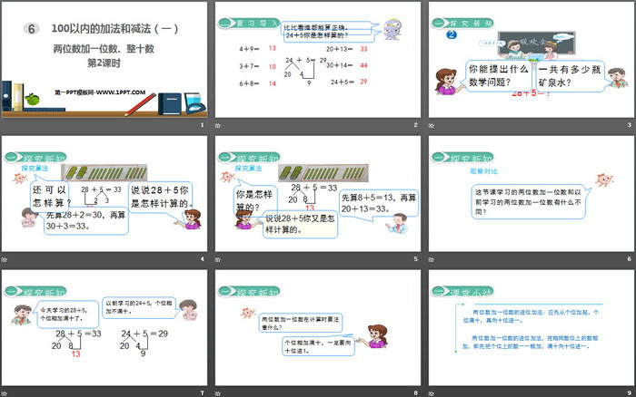 关键词:人教版一年级下册数学PPT课件免费下载,两位数加一位数整十数PPT下载,100以内的加法和减法PPT下载,.PPT格式;