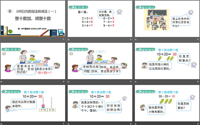 关键词:人教版一年级下册数学PPT课件免费下载,整十加减整十数PPT下载,100以内的加法和减法PPT下载,.PPT格式;