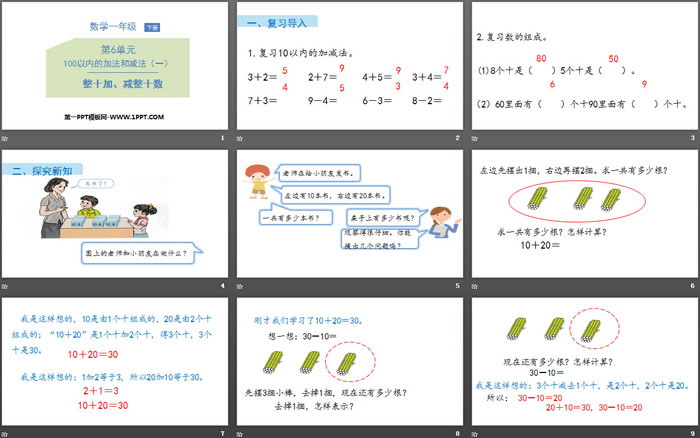 关键词:人教版一年级下册数学PPT课件免费下载,整十加减整十数PPT下载,100以内的加法和减法PPT下载,.PPT格式;