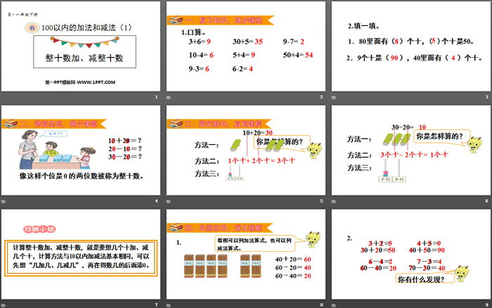 关键词:人教版一年级下册数学PPT课件免费下载,整十数加减整十数PPT下载,100以内的加法和减法PPT下载,.PPT格式;
