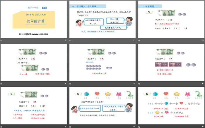关键词:人教版一年级下册数学PPT课件免费下载,简单的计算PPT下载,认识人民币PPT下载,.PPT格式;