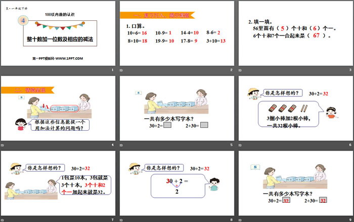 关键词:人教版一年级下册数学PPT课件免费下载,整十数加一位数及相应的减法PPT下载,100以内数的认识PPT下载,.PPT格式;