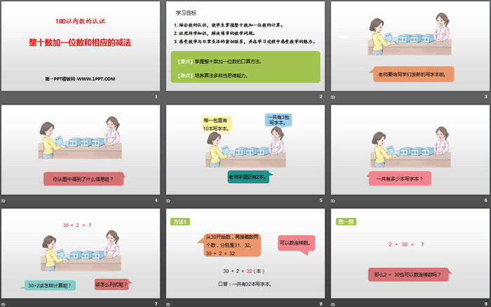 关键词:人教版一年级下册数学PPT课件免费下载,整十数加一位数及相应的减法PPT下载,100以内数的认识PPT下载,.PPT格式;