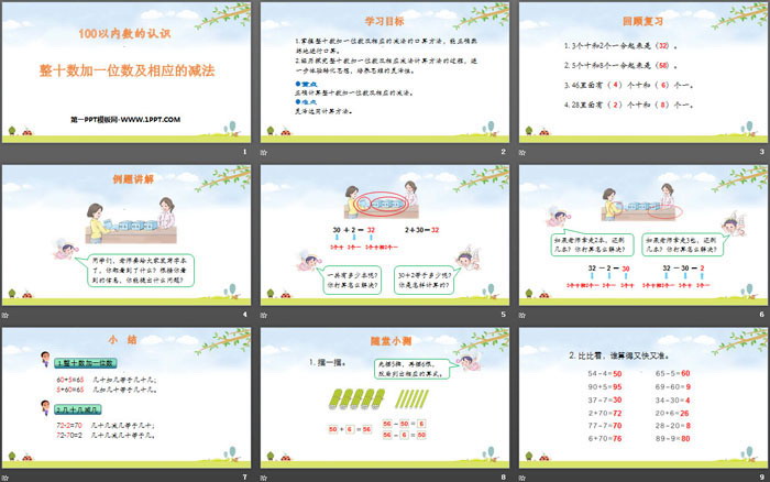 关键词:人教版一年级下册数学PPT课件免费下载,整十数加一位数及相应的减法PPT下载,100以内数的认识PPT下载,.PPT格式;