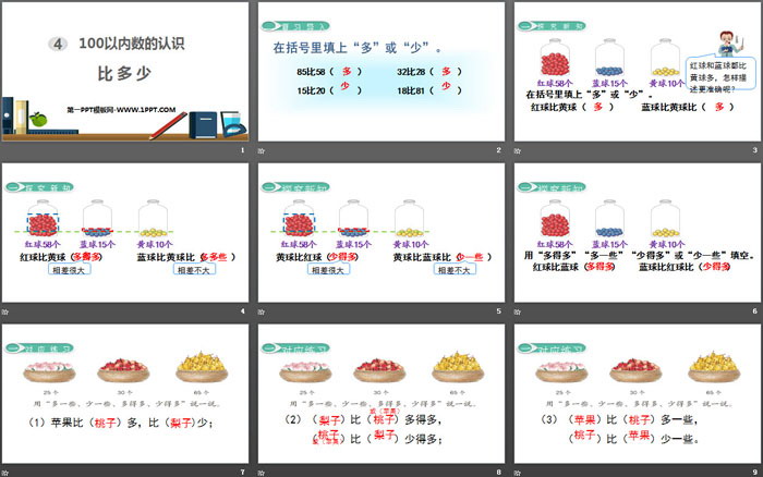 关键词:人教版一年级下册数学PPT课件免费下载,比多少PPT下载,100以内数的认识PPT下载,.PPT格式;