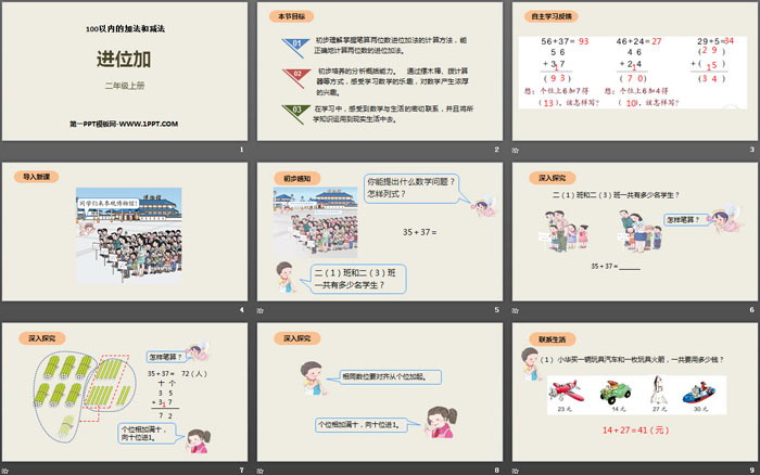 关键词:人教版二年级上册数学PPT课件免费下载,进位加PPT下载,100以内的加法和减法PPT下载,.PPT格式;