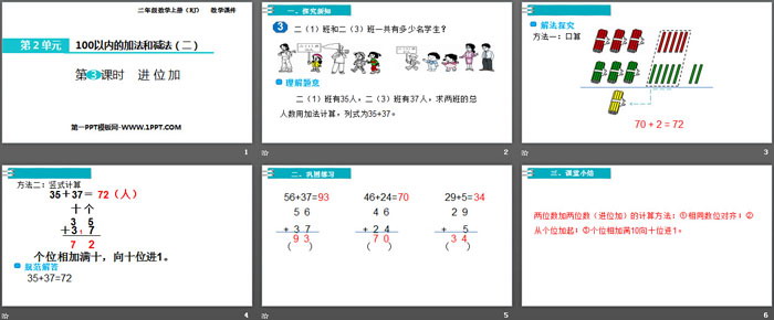 关键词:人教版二年级上册数学PPT课件免费下载,进位加PPT下载,100以内的加法和减法PPT下载,.PPT格式;