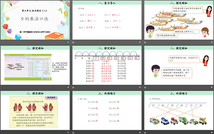 关键词:人教版二年级上册数学PPT课件免费下载,9的乘法口诀PPT下载,表内乘法PPT下载,.PPT格式;