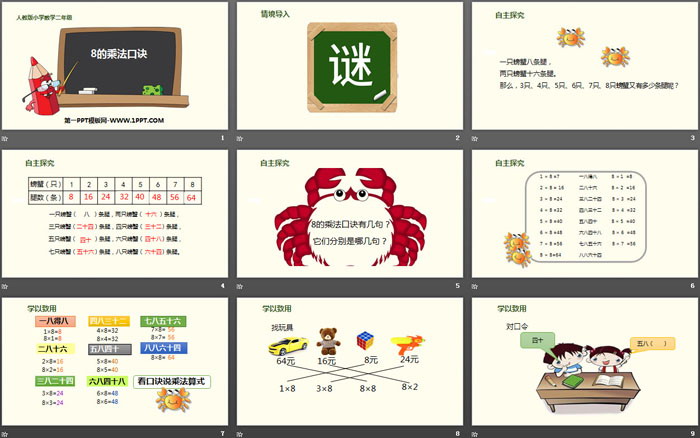 关键词:人教版二年级上册数学PPT课件免费下载,8的乘法口诀PPT下载,表内乘法PPT下载,.PPT格式;