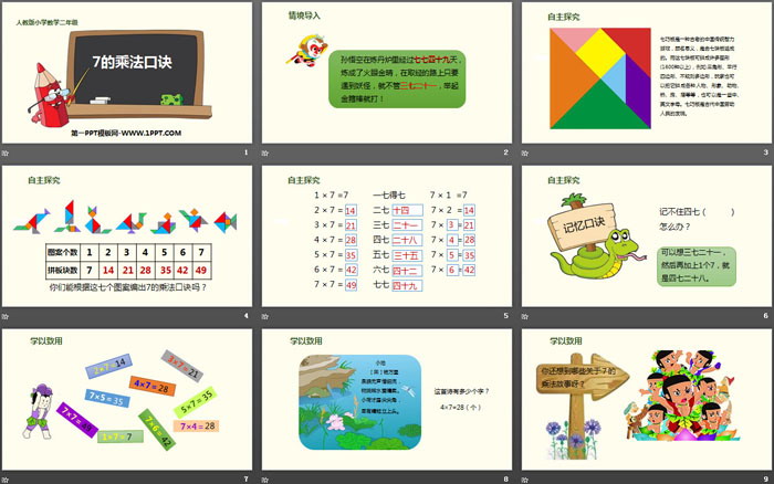 关键词:人教版二年级上册数学PPT课件免费下载,7的乘法口诀PPT下载,表内乘法PPT下载,.PPT格式;