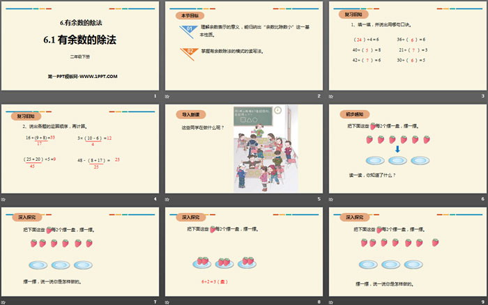 关键词:人教版二年级下册数学PPT课件免费下载,有余数的除法PPT下载,.PPT格式;