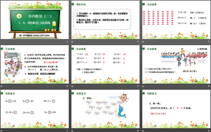 关键词:人教版二年级下册数学PPT课件免费下载,789的乘法口诀求商PPT下载,表内除法PPT下载,.PPT格式;