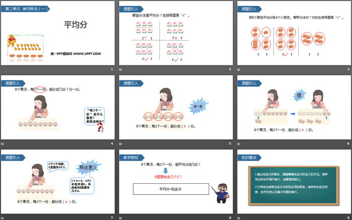 关键词:人教版二年级下册数学PPT课件免费下载,平均分PPT下载,表内除法PPT下载,.PPT格式;