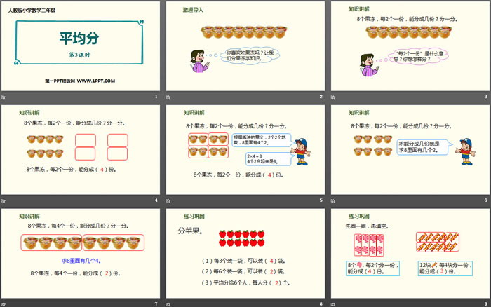 关键词:人教版二年级下册数学PPT课件免费下载,平均分PPT下载,表内除法PPT下载,.PPT格式;