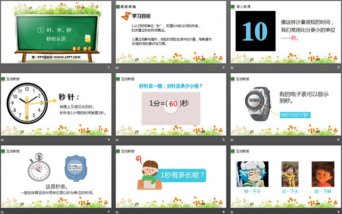 1.认识时间单位“秒”,知道分与秒之间的关系,初步建立秒的时间概念。