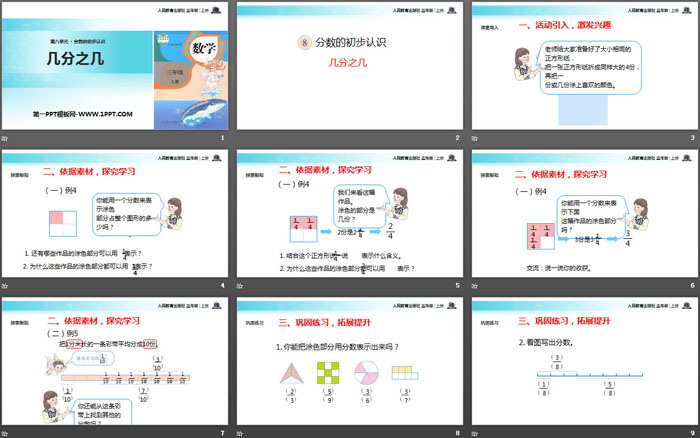 关键词:人教版三年级上册数学PPT课件免费下载,几分之几PPT下载,分数的初步认识PPT下载,.PPT格式;