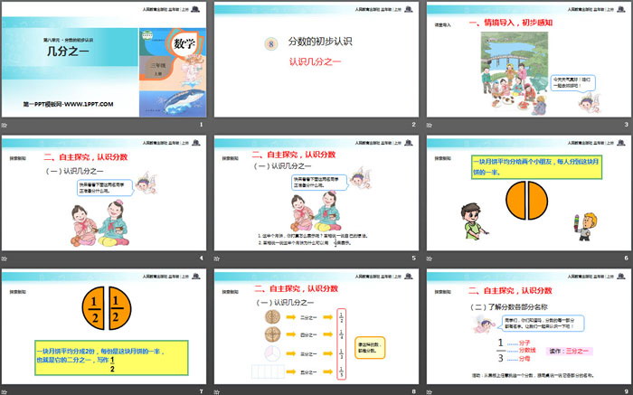 关键词:人教版三年级上册数学PPT课件免费下载,几分之一PPT下载,分数的初步认识PPT下载,.PPT格式;