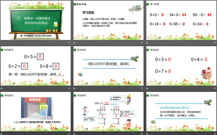 关键词:人教版三年级下册数学PPT课件免费下载,商中间有0的除法PPT下载,除数是一位数的除法PPT下载,.PPT格式;