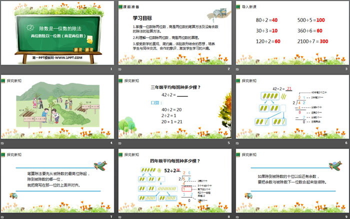 关键词:人教版三年级下册数学PPT课件免费下载,除数是一位数的除法PPT下载,两位数除以一位数商是两位数PPT下载,.PPT格式;