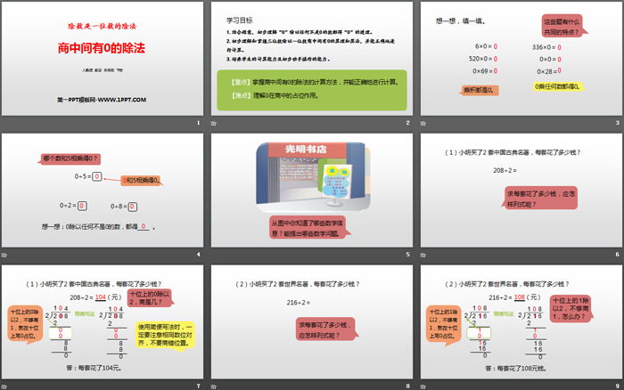 关键词:人教版三年级下册数学PPT课件免费下载,商中间有0的除法PPT下载,除数是一位数的除法PPT下载,.PPT格式;