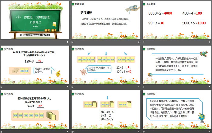 关键词:人教版三年级下册数学PPT课件免费下载,口算除法PPT下载,除数是一位数的除法PPT下载,.PPT格式;