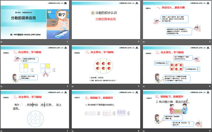 关键词:人教版三年级上册数学PPT课件免费下载,分数的简单应用PPT下载,分数的初步认识PPT下载,.PPT格式;