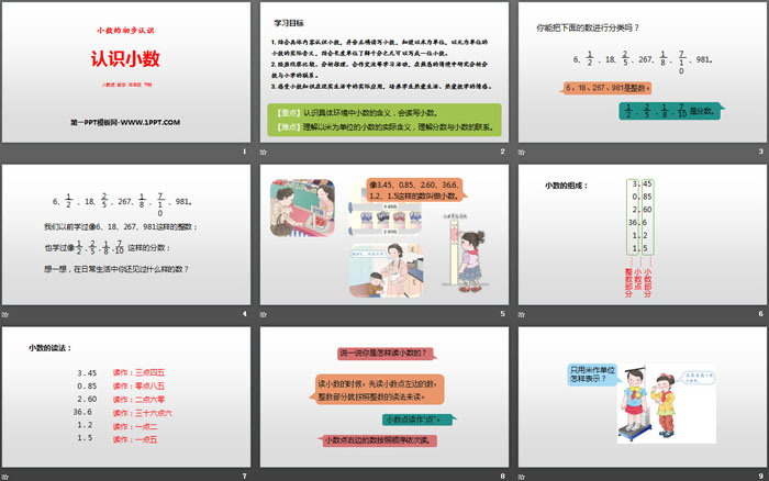 1.结合具体内容认识小数,并会正确读写小数,知道以米为单位,以元为单位的小数的实际含义,结合长度单位了解十分之几可以写成一位小数。