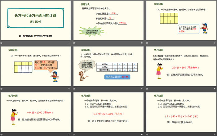 关键词:人教版三年级下册数学PPT课件免费下载,长方形正方形面积的计算PPT下载,面积PPT下载,.PPT格式;
