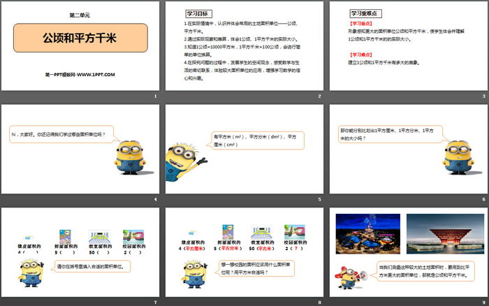 关键词:人教版四年级上册数学PPT课件免费下载,公顷和平方千米PPT下载,.PPT格式;