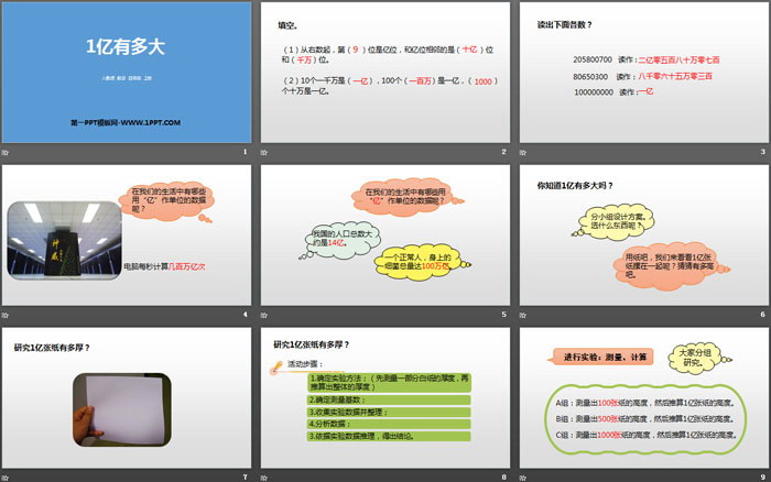 关键词:人教版四年级上册数学PPT课件免费下载,1亿有多大PPT下载,大数的认识PPT下载,.PPT格式;
