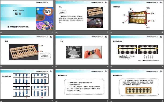 关键词:人教版四年级上册数学PPT课件免费下载,算盘PPT下载,大数的认识PPT下载,.PPT格式;