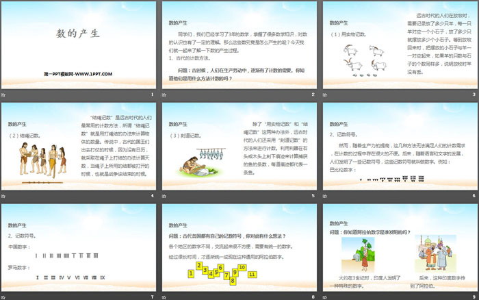 关键词:人教版四年级上册数学PPT课件免费下载,数的产生PPT下载,大数的认识PPT下载,.PPT格式;